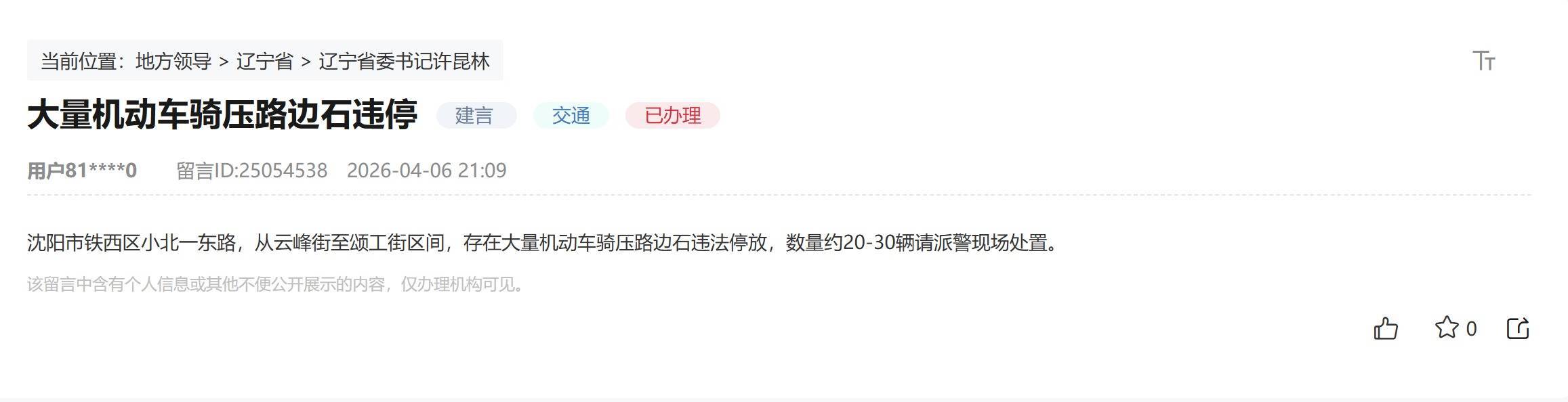 人民网沈阳4月12日电(记者王斯文)“沈阳市铁西区小北一东路云峰街至颂工街区间,大量机动车骑压路边石违法停放,数量约20至30辆,请派警现场处置。”近日,家住沈阳市铁西区的网友在人民网 “领导留言板”留言,反映路段机动车违停占道问题,希望相关部门及时处理。